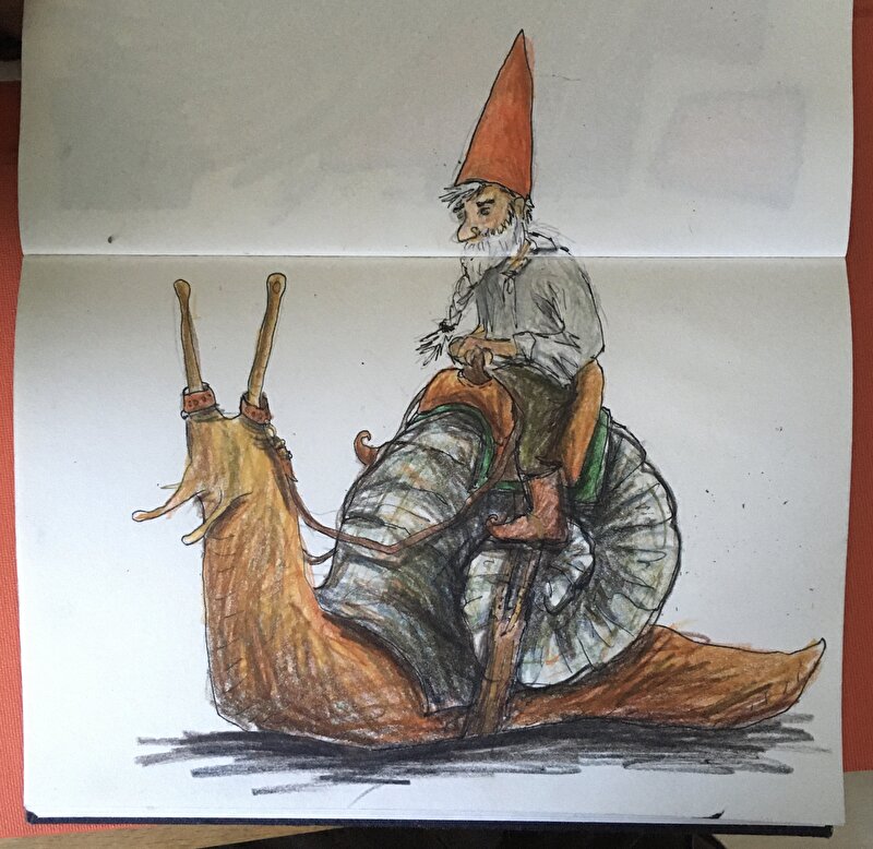 Het ontbreekt mij nog volledig aan ideeën voor een poster maar ik heb wel gisteravond een kabouter op een slak getekend. De slakken zijn blijkbaar ook mijn hoofd nog niet uit.
