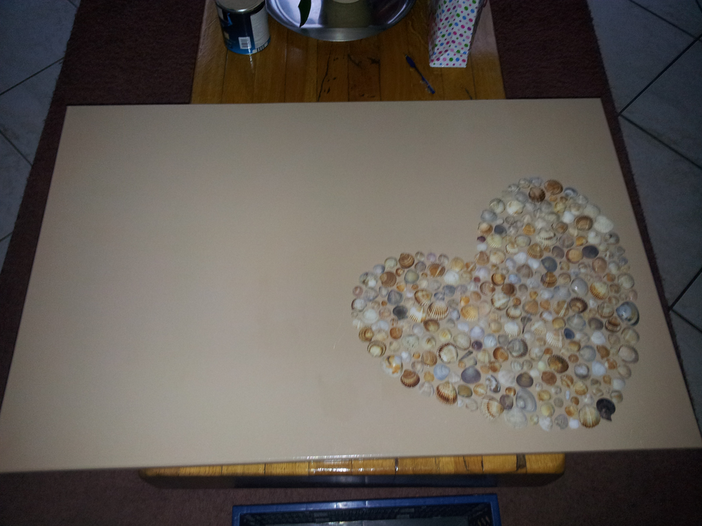 Ik heb hem toch iets kleiner gemaakt omdat ik anders schelpen tekort kwam. Vervolgens een rand uitgeknipt waarbinnen ik zou gaan werken.