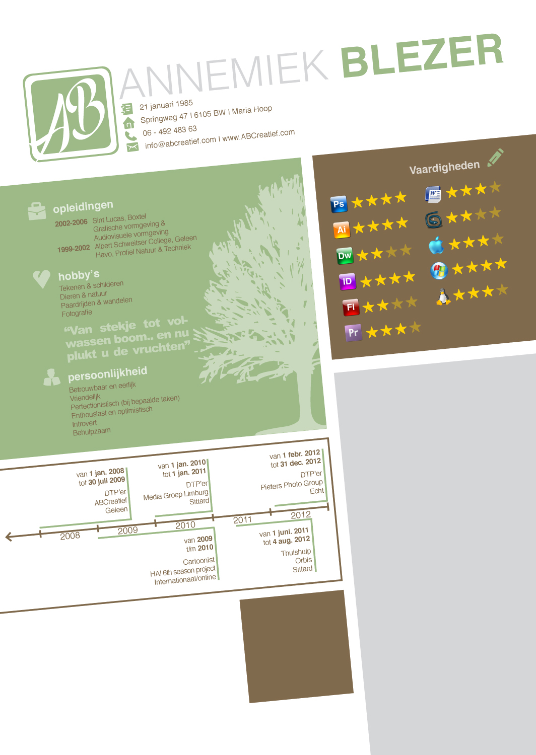 Het ontwerp is een combinatie van mijn CV-ontwerp en het ontwerp van mijn visitekaartje voor de tekeningen/schilderijen die ik maak..