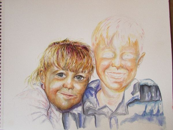 A3, Aquarel, er zitten nu ongeveer vijf lagen op het meisje en het jongetje... tsja. Die heeft nog wel eventjes wat zon nodig. De foto is niet voor openbaar gebruik beschikbaar, dus jullie zullen het hiermee moeten doen. Een beetje aanmoediging en eventuele tips kan ik wel gebruiken, met deze korte tijd zeker
