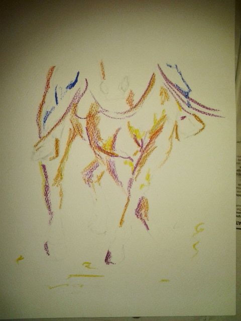 Dansende benen, met ecoline, witte fineliner en waskrijt op 24x32 300gr aquarelpapier