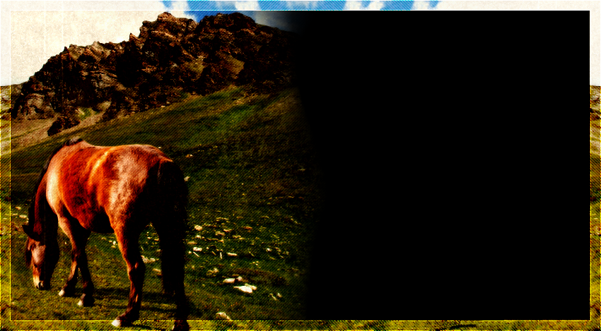 Ik vind het 'overlopen' van paard in de wei naar zwart niet zo mooi gaan, ik zou eerder heel de achtergrond paard in de wei houden en dan op dezelfde plek als nu zwart is een vierkant met een mooi kader eromheen dat heel licht doorschijnd, snap je wat ik bedoel? Verder vind ik hem echt super!