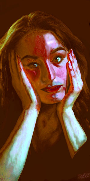 Het kleurgebruik is inderdaad prachtig. Het groen-rood is haast spookachtig. De rode schaduwaanzet lijkt bijna bloed op je handen.