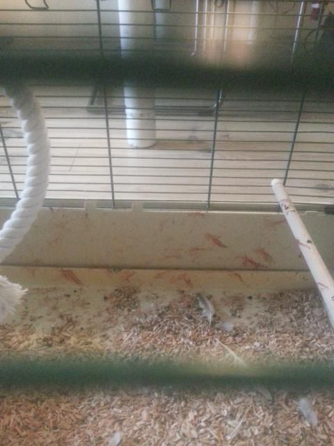 Zo te horen heeft hij wat bloedpennen (afgebroken vleugelpennen). Komt idd wel weer goed. Het zal meer de schrik zijn en dan lijkt een klein druppeltje bloed al snel een hele berg wanneer het uitgesmeerd is.