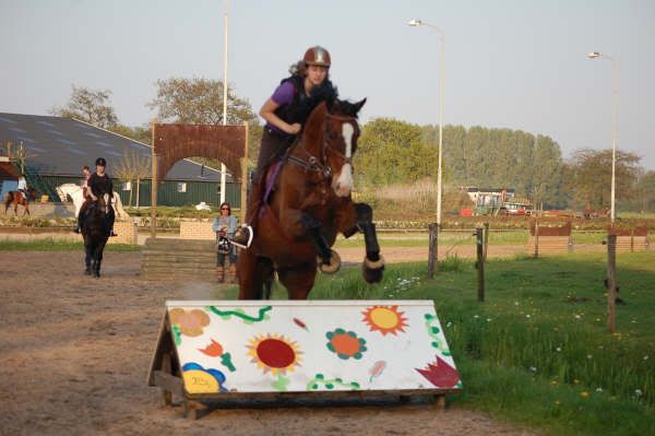 de 1e keer was erg spannend maar hij sprong wel, daarna sprong ie ineens heel hoog, ja, dan kom je niet goed uit bij de 2e, dus ik verloor mn evenwicht en viel naar rechts eraf, heb nog wat mooie actiefoto's :j :))