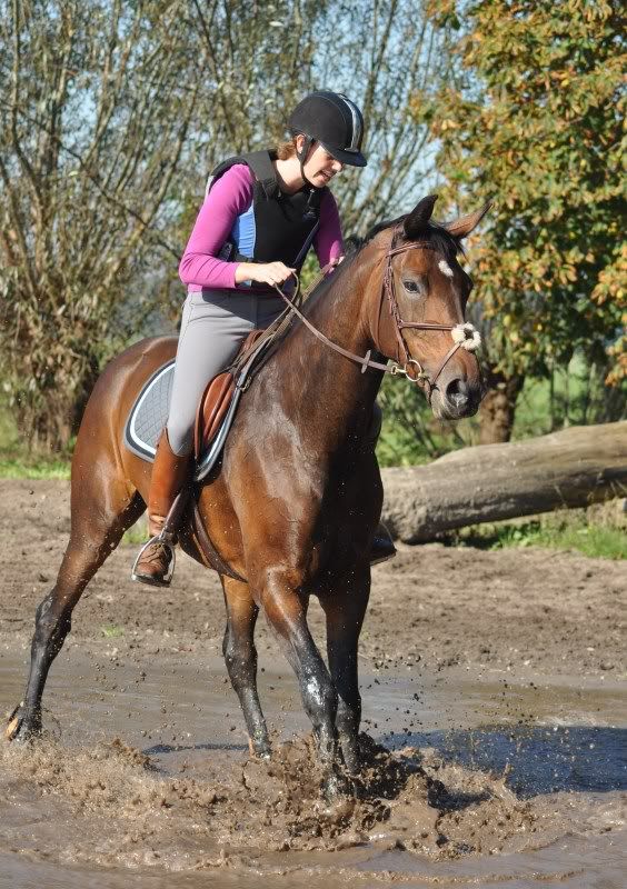 We moesten rondjes in en uit het water lopen. Tous ging er in het begin met een sprongetje in. Maar later ging het beter.