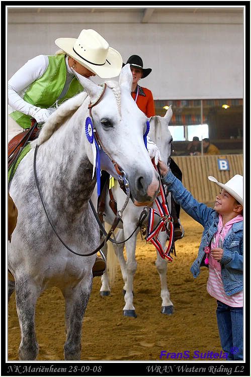 Zelf vierde ik mijn 1-jarig reining lustrum (vorig jaar in Marienheem vond ik het als toeschouwer zo leuk dat ik toen besloot hier wil ik aan meedoen) en mijn eigen finaleplaats met Rooster bij de L2 was ver boven verwachting (en voor 90% Roosters verdienste). De finale rijden met die volle tribunes was puur genieten. Over die rit ben ik zelf ook heel tevreden omdat ik Rooster echt reed in plaats van te "passagieren". Hier kan ik mee verder!!!