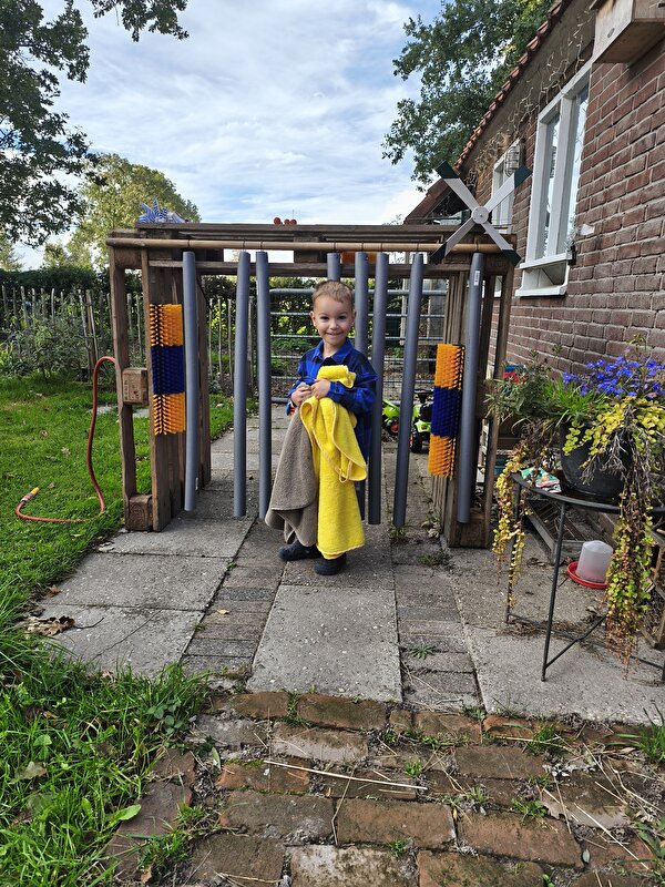 Hidde heeft zelfs zn eigen wasstraat, met isolatiemateriaal van buizen en de borstels waren eigenlijk voor de paarden bedoeld :-D