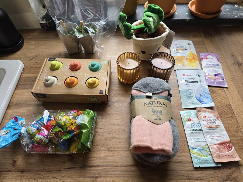 de inhoud! Wat een prachtig pakket! Wat lekkers voor mijzelf, de katten en paarden, een té leuke bakvorm en maskers voor me time!
