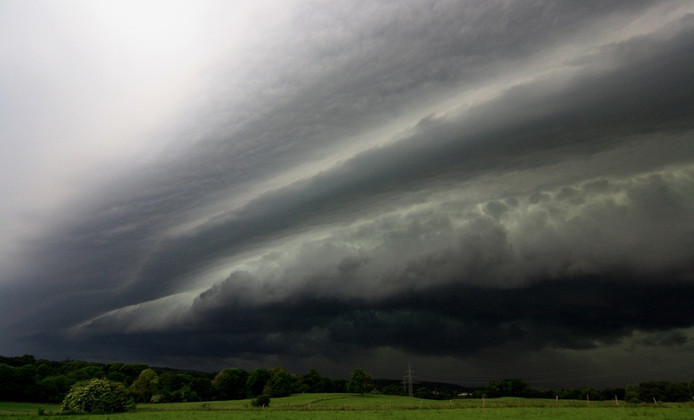 Omdat ik de afgelopen week nu al twee keer een geweldig mooie regen/onweerslucht over me heen heb gekregen en twee keer geen foto's kon maken ben ik eens gaan kijken naar wat ik nou precies gezien had. Dat is natuurlijk niet heel betrouwbaar, maar het 'driedubbele Engelse dropje' met drie lagen wolken boven elkaar dat ik in het vorige topic beschreef dat met een enorm heftige (maar ook erg korte) regen- en onweersbui over de stal trok was exact dit: https://images0.persgroep.net/rcs/vvgsF ... uality=0.9