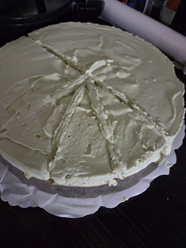 (De groene kleur hoort er wel bij. Het is een matcha-kwarktaart)