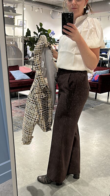 Ik ben nu echt geslaagd! En ja de broek is bijna het zelfde alleen fijnere stof en voelt voor mij dan al veel comfortabeler. De blouse is heel mooi glimmend en een strikje voor in mijn nek. Jasje erbij voor als het wat kouder is