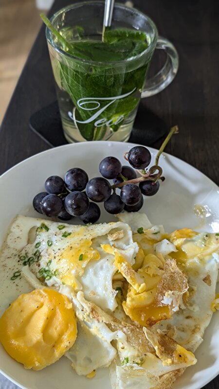 De druiven, bieslook en wollige munt staan er ook prachtig bij, dus die heb ik verwerkt in mijn lunch