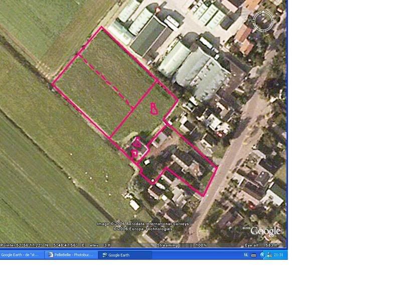 Al het groene beneden de bebouwing en boven de dode ijssel arm (het water) is de wei van Connor. De markering staat op de boven wei die bij hoog water niet onderloopt. Links daarvan zit de bak met daaronde de paddock. Daar weer links van staat Connors box en de 4 binnenstallen zitten meteen boven de bak.