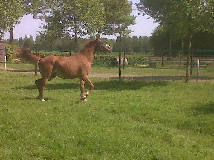 Met die van ons gaat het ook heel goed, is 4 wkn geleden gecastreerd en nu sinds vandaag voor het eerst met m'n twee andere merrie's op de wei, ging erg goed en hij vond het één groot feest. De 22e is 'ie officieel 2 geworden en inmiddels al 1.73m hoog dus hoop niet dat 'ie nog erg doorschiet nu die gecastreerd is.