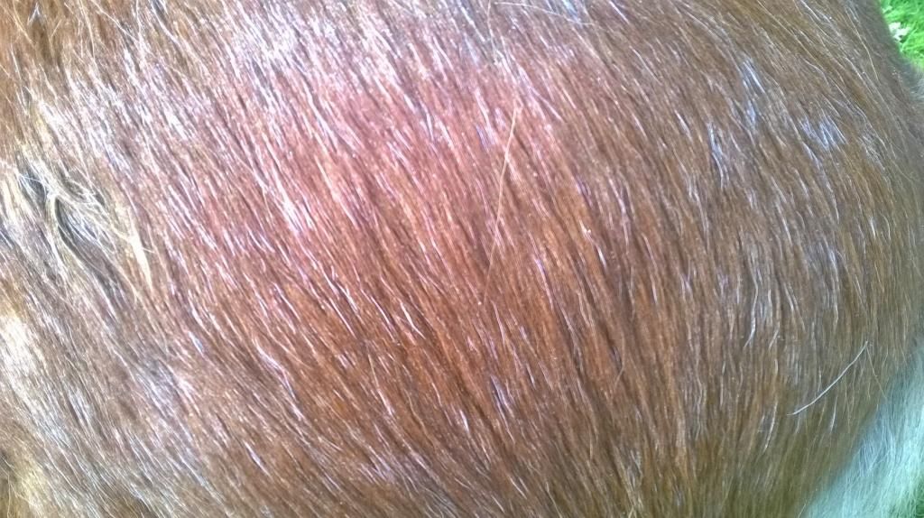 Pony in kwestie is 7 jaar en heeft die twee vlekjes al zijn hele leven en kreeg vanaf zijn 3de jaar ongeveer witte haren door de vacht, het lijkt niet erger te worden met de jaren, maar hij is wel een beetje een toverbal zomers.