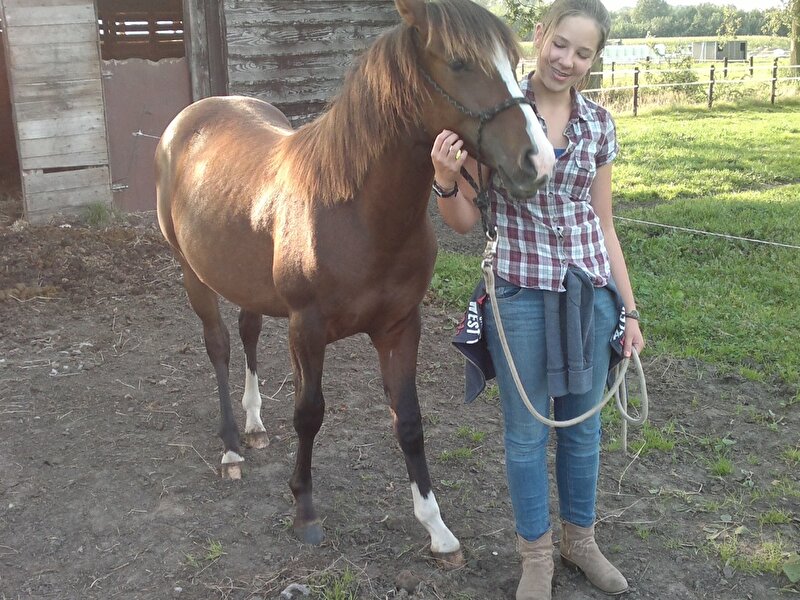 Het is allemaal begonnen met een paintmerrie Lola die samen in de wei heeft gestaan met een arabische hengst Red. Lola's huidige eigenaar kocht Lola en betaalde 200€ extra voor het veulen waar ze misschien drachtig van zou zijn. Dus wij wachtten af. Lola werd dikker maar we waren niet zeker of ze drachtig zou zijn. Ze had tot oktober om te bevallen. Als ze dan niet bevallen was, was ze niet drachtig. Maar dan op een regenachtige dinsdagmorgen in september. Ik was op school, krijg ik een berichtje van mijn peter: 'Lola is bevallen van een vos hengstje met een witte bles en 3 witte voetjes'. Na school reden we meteen naar hem toe om hem te bekijken. Ik was meteen verliefd. Hij was het eerste pasgeboren veulentje dat ik had gezien.