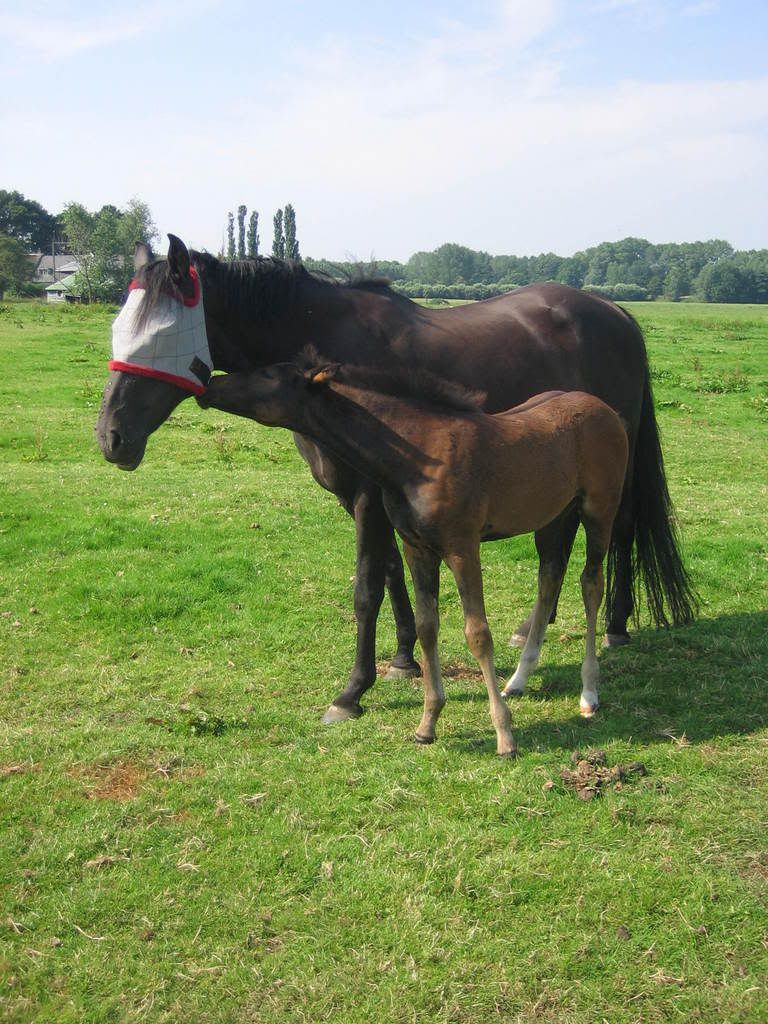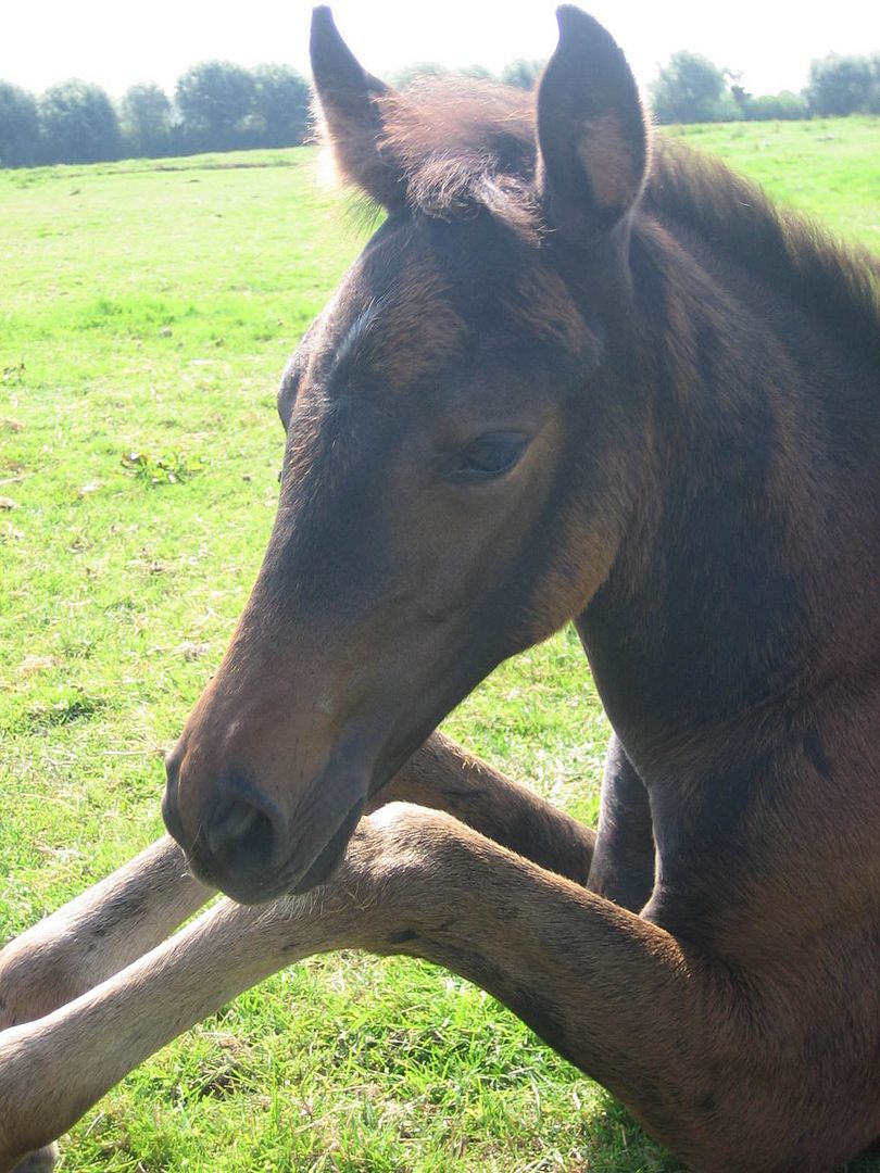 Jouw veulentje is op dit moment gewoon een tikkie kaal. Je ziet de zwarte huid, daarom lijkt ze zwart. 't Is gewoon een bruine, dat kun je aan de veulenvacht zien, en ik vermoed zelfs dat ze niet eens echt donkerbruin zal worden, gezien haar veulenkleur.