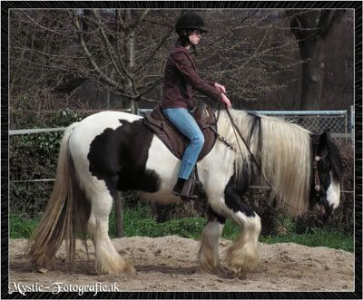 ). Die staat er om bekend om zijn zgn. spastische trekjes.... Meneer kan dus ook schrikken om niets met het gevolg dat hij of op de rem gaat of opzij springt of zijn kont eronder schiet en je opeens in galop zit. Is me afgelopen zaterdag weer een keer of 3 overkomen... Gelukkig ben ik ze gewend van Fayette en is Flanagan altijd weer erg goed terug te rijden