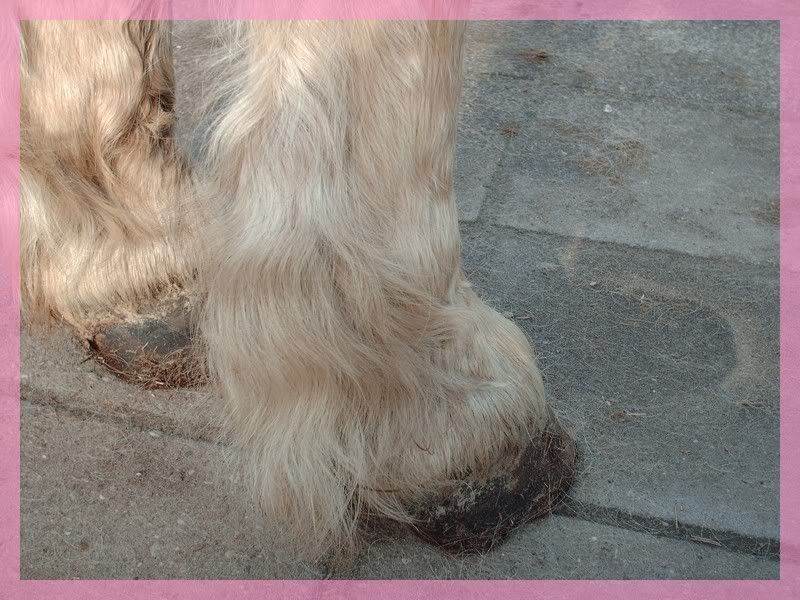 Ik heb het er bij de mijne aan laten zitten. Ik vind het mooier. Maar laatst zei een vrouwtje bij mij op stal: "Vind je die sokken nou mooi? Ik wil ze wel voor je afscheren, hoor." Blijkbaar vond zij ze niet mooi. Ik vind persoonlijk van die kale voetjes lelijk.