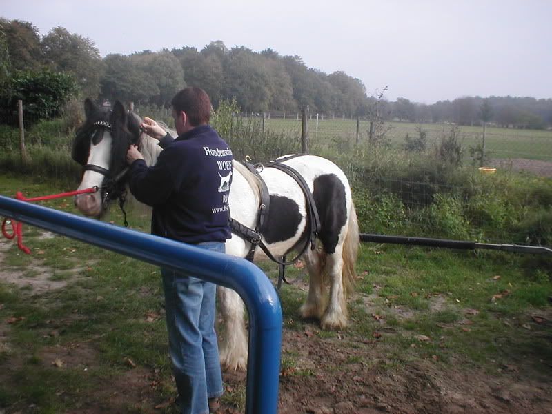 Djowy is een ruin van 8 jr. Wij hebben hem een klein jaartje nu. Djowy is de laatste weken aan het werk geweest voor de sleep (onze buitenbak is nog nooit zovaak aangesleept) en we dachten dat hij er klaar voor was om vandaag voor het eerst voor de wagen te gaan