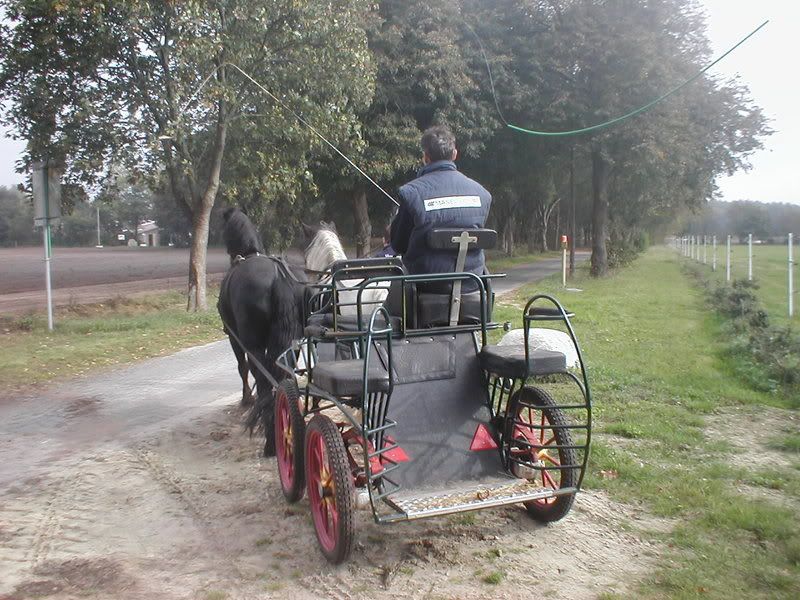 Samen met Feyona, een Friese merrie van een vriendin van me, die dikwijls voor de kar loopt ging Djowy in tweespan.