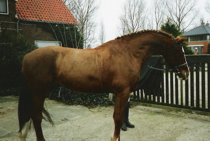 Bij dit paard zijn de tuigergenen goed te zien, met name door de verticaal geplaatste hals, met rijden moet je hier rekening mee houden (zag dat je dat doet Knipoog ) door hem rond te rijden. Zijn rug is het zwakke deel. Hij heeft een mooi verloop van hals-schoft, maar de schoft rugverbinding mocht vloeiender, verhouding halslengte met de rug is prima. Hij heeft ietwat zwakke lendenen en een licht afhangende croupe met mooi ingeplante staart. Hij heeft een lichtjes stijle schouder met keurige voorbenen. De achterhand is mooi gevormd, maar het dier heeft een stijl achterbeen. Ook bevallen de lengte van het paard ten opzichte van de hoogte mij niet zo. Hij is namelijk hoger dan hij lang is en hij heeft lange benen, hierdoor zal hij zich sneller in de ballen van de hoef trappen. Verder lijkt hij op de foto wat bokbenig te staan. Op de foto in een van de linkjes is dit nog duidelijker te zien. Hij heeft grote hoeven. Aan de andere foto's te zien heeft hij een stuwende draf, maar loopt hij netjes in tact.