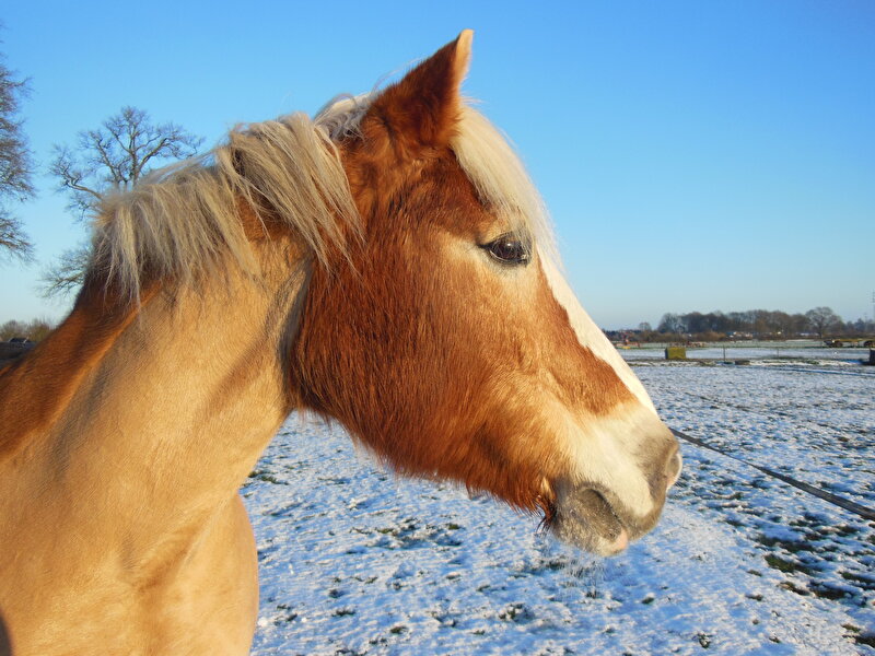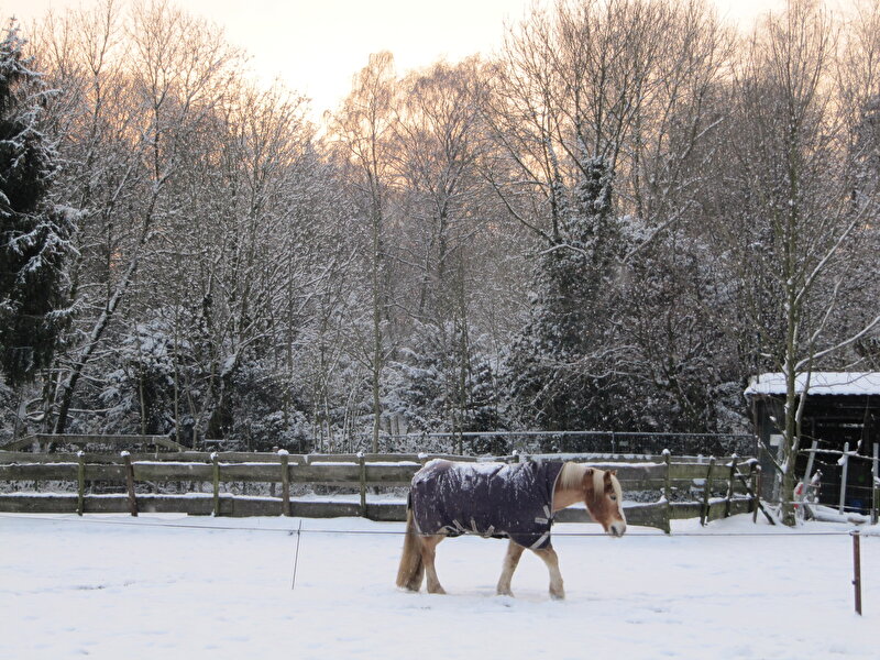 Hij krijgt sneeuwbeslag van de hoefsmid, zodat hij ook in de winter lekker 24/7 op de wei kan blijven.