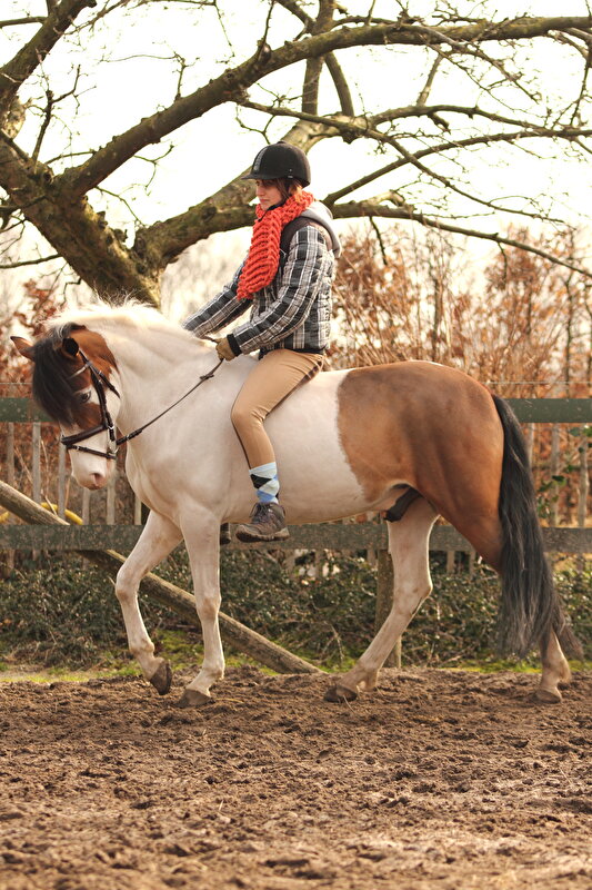 Deze foto is in de les gemaakt, ik heb hem de eerste maanden vooral lang en laag getraind. Normini is zijn hele leven alleen maar van hand tot hand gegaan. Ik heb redelijk wat informatie over plekken waar hij geweest is en ik ben er niet jaloers op.. Een paar jaar op verschillende maneges, maar daarvoor is hij absoluut niet braaf genoeg, en daardoor steeds weer verkocht. Verder hebben heel veel mensen hem gekocht met het idee ''wat een leuke pony, die leer ik wat en verkoop hem weer.'' Met als gevolg dat hij gereden is op een manier die er misschien wel leuk uitzag (kop in de krul) maar die voor hem helemaal niet goed was (hij maakt zicht kort en zet zich vast). Vandaar dat ik in het begin hem fijn die spier in zijn rug heb laten oprekken. Op dit moment kon hij al best laag (lager dan op de foto). Langzaamaan pak ik hem nu ook meer op zodat hij minder op de voorhand valt. Ik rijd hem nog altijd in veel verschillende houdingen.
