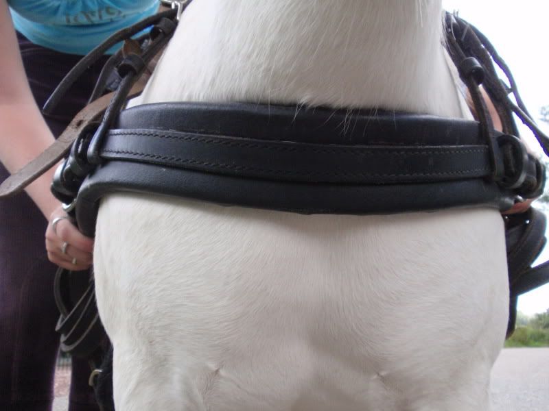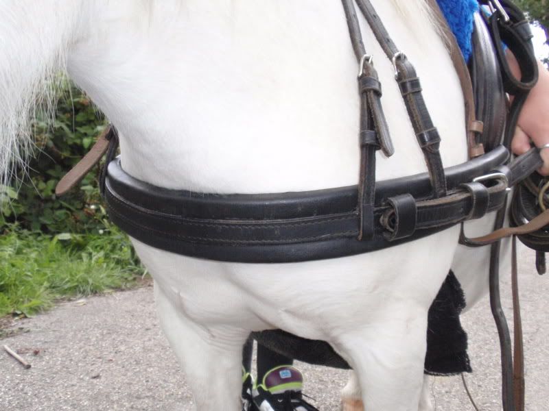 Daarbij zul je heel snel merken als hij dus te hoog zit en te veel tegen de luchtpijp, want je zal onmiddelijk ademhalings'problemen' bemerken bij je pony. Daar hoef je dus niet bang voor te zijn, de luchtpijp ligt nog een stukje hoger als waar jij op de foto je borsttuig hebt hangen :)