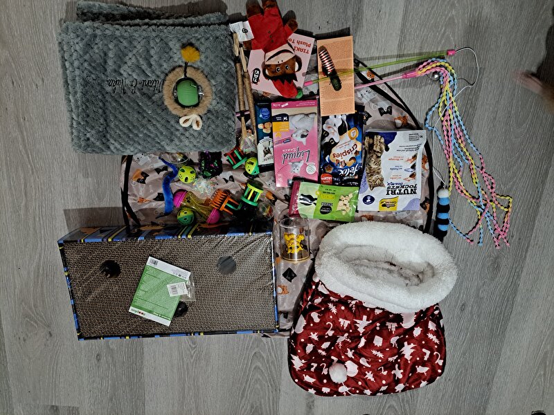 Ik begon met de kleine cadeautjes; hier zaten hele toffe speelballen in! En muisjes en veertjes. Er zitten hier al 5 katten me aan te staren wanneer ze ermee mogen spelen.