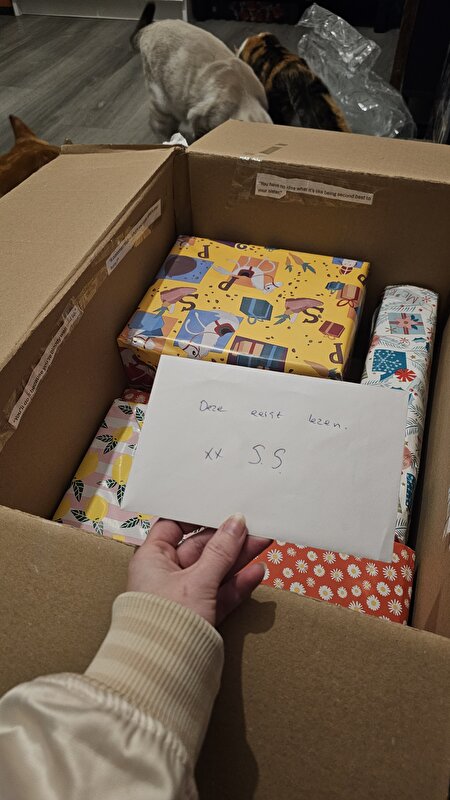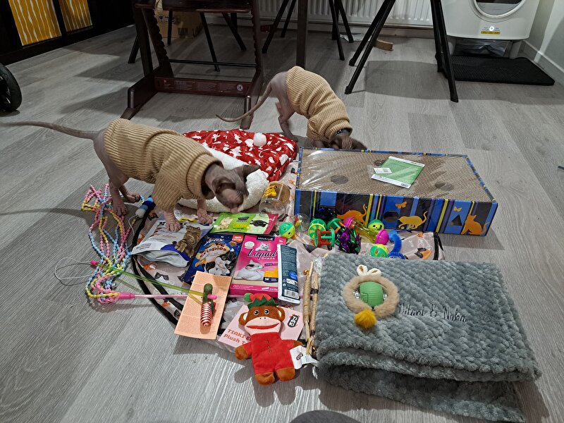 . Haar katten hebben een doos gekregen. Oh ja, met een toffe inhoud. Maar toch, een doos