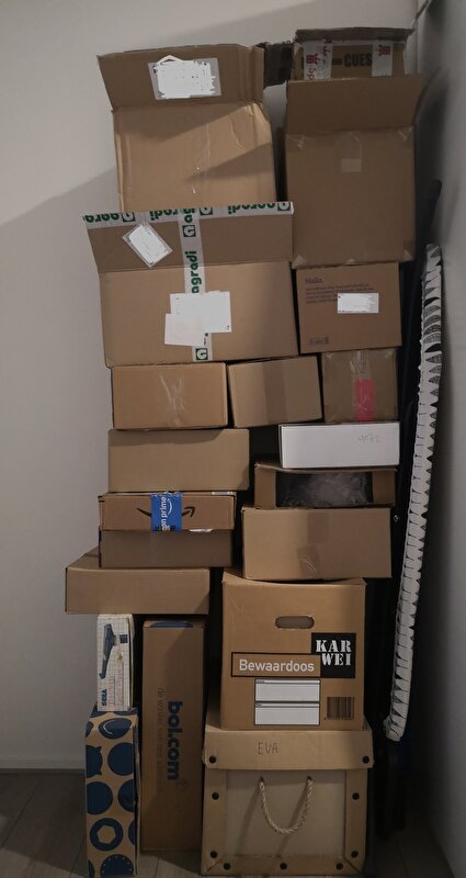 Ter beeldvorming, er zitten ook nog een heleboel dozen en verpakmateriaal verborgen in deze dozenstapel.