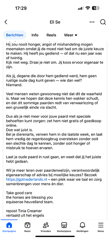ikkedus schreef:Iemand deelde ooit eens deze post op FB en dat is precies waar dit over gaat. Ik ben het dan ook helemaal eens met wat zij en de mensen in dit topic zeggen; laat dit paard zelf gaan aub of zet haar inderdaad op pensioen.