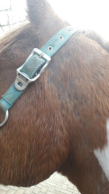 Hopelijk kan iemand hier ons helpen! Sinds een week of 6 heeft m'n pony gekke kale plekken. Het begon met gele korstige, pijnlijke plekken in de manen. De DA heeft een afkrabsel genomen en getest op schimmel en bacteriën, beiden negatief. Toen begonnen met het smeren van hydrocortiderm, met een week waren de korsten weg. Vandaag tref ik haar aan met grote kale plekken boven in haar hals. Volgens mij jeukt het niet, het lijkt eerder pijnlijk. De huid is ook wat gezwollen en geïrriteerd. Heeft er iemand een idee wat dit kan zijn?