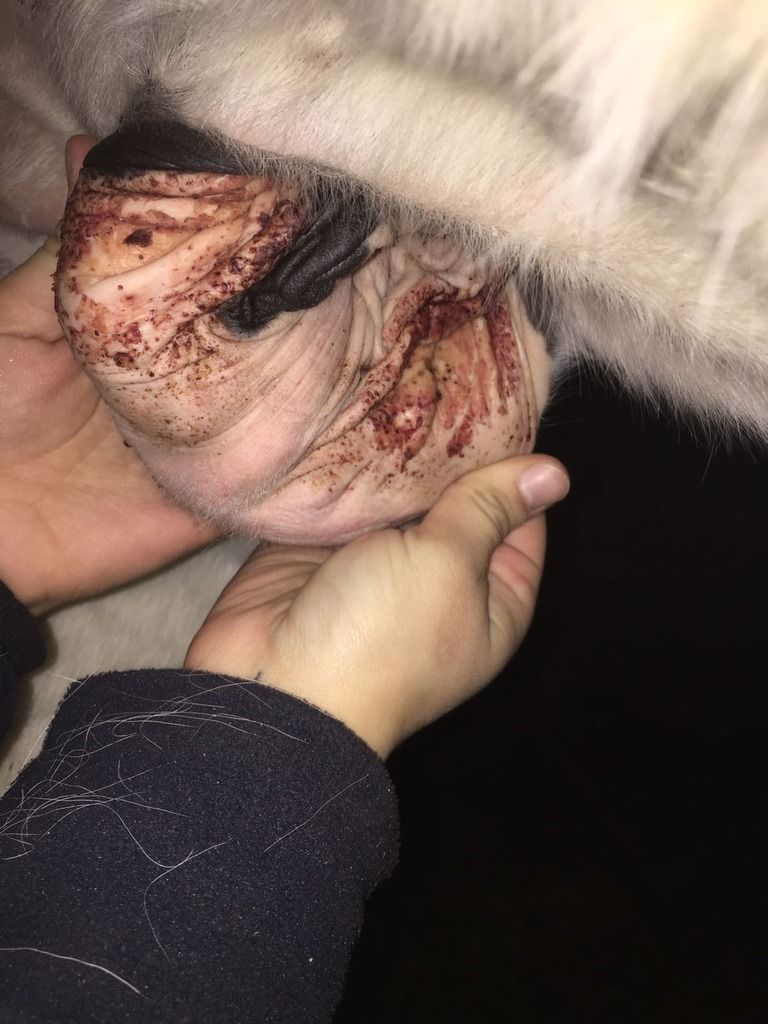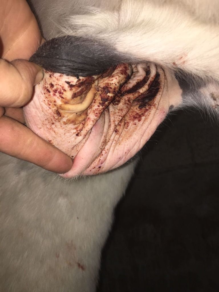 Ik zou hier ook geen veearts voor laten komen, dit is namelijk helemaal geen raar beeld bij een ruin met een dergelijke lichte kleur zoals het nu te zien is op de foto en het is zeker geen bloed.