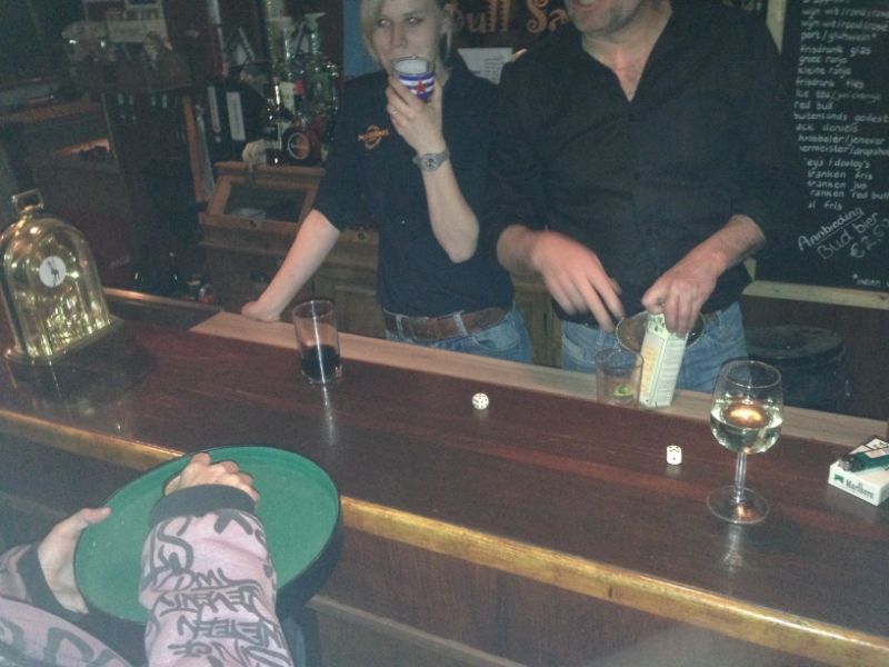toen iedereen al weg was en wij nog aan de bar zaten te borrelen, uhm...dobbelen