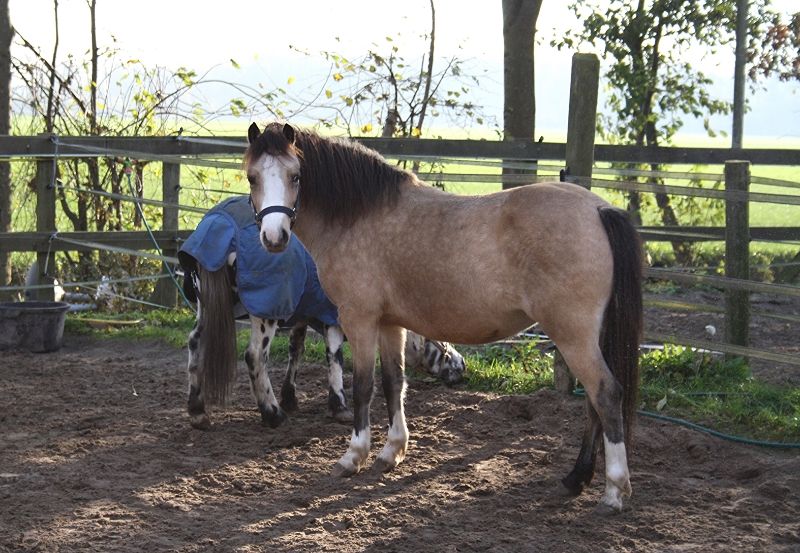 Mijn eigen merrie is een valk welsh A merrietje met een stokmaat van 1,17, vorig jaar netjes stamboekopgenomen met een 1A premie en een van mijn 'fokmerrietjes', ik fok niet zo vaak, om het jaar een a twee veulentjes, liefst voor mezelf. Ze is uitgerekend eind april/ begin mei (moet nog even de precieze datum berekenen). Ze heeft al eerder een veulentje gehad, dit was een probleemloze bevalling en het veulen heeft er ruim 9 maanden bijgelopen, ze is een topmoeder en bleef super mooi vol in conditie met zolang een veulen aan de voet.