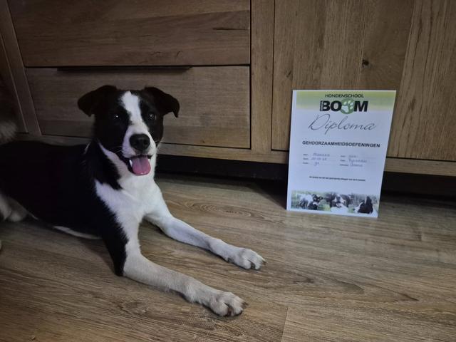 Samen met Yuki ben ik vrijwel direct begonnen met puppy cursus. Hij kon niks. Luisterde niet naar zijn naam, kon niet zit, of hier komen of wat anders. Hij kon echt niks. Heb veel tijd er in gestopt en eind juli heeft ie z'n diploma gehaald. Eerst puppy cursus en daarna A cursus en daar een examen voor gedaan wat super goed ging