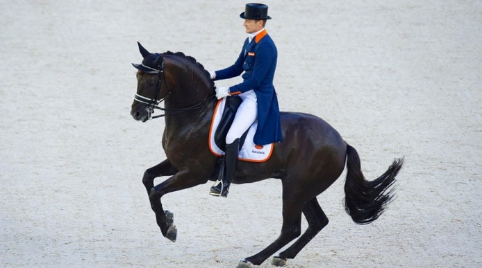 Ze rijdt zonder zadel en de foto is van schuinonder genomen.