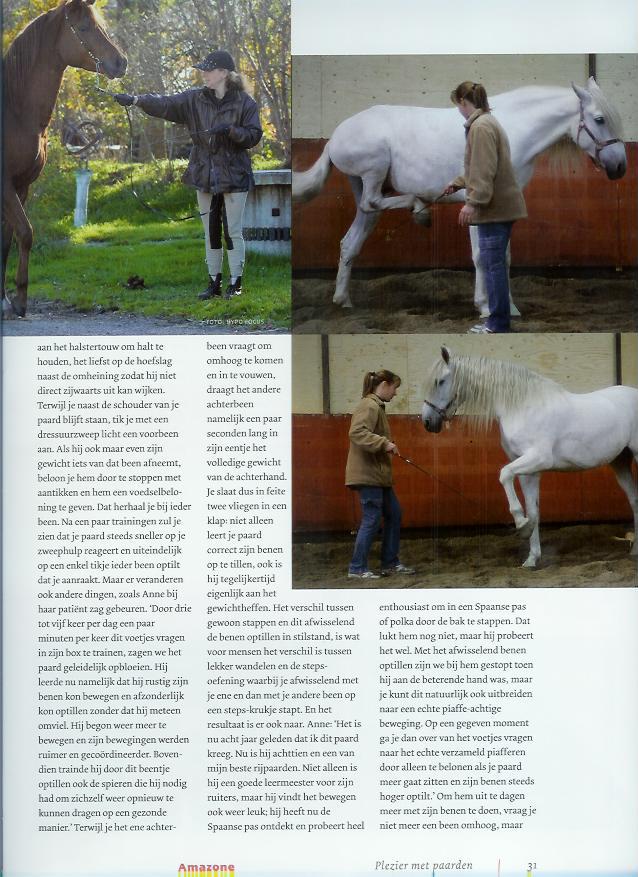 Stond een artikel in de amazone aantal jaar terug. Daar werd piaffe in vrijheid met klikkertraining aangeleerd bij een paard dat o bespiering had en coördinatie problemen en kreupel erdoor. 10x per dag 2min. oefenen zoiets. Dier liep na paar maanden geheel rad, super bespiering, etc. Piaffe zonder afdwingen gaf hem de mogelijkheid om opnieuw zijn lijf leren balanceren en spieren op te bouwen.