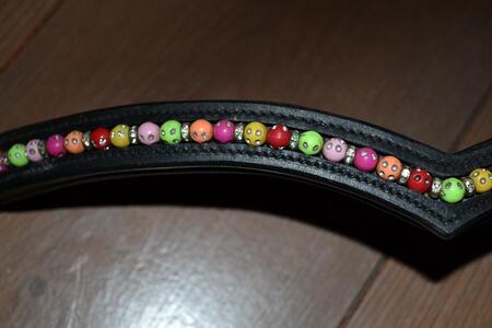 Érg leuke V-frontriem, zwart met gekleurde bolletjes en glimmetjes.