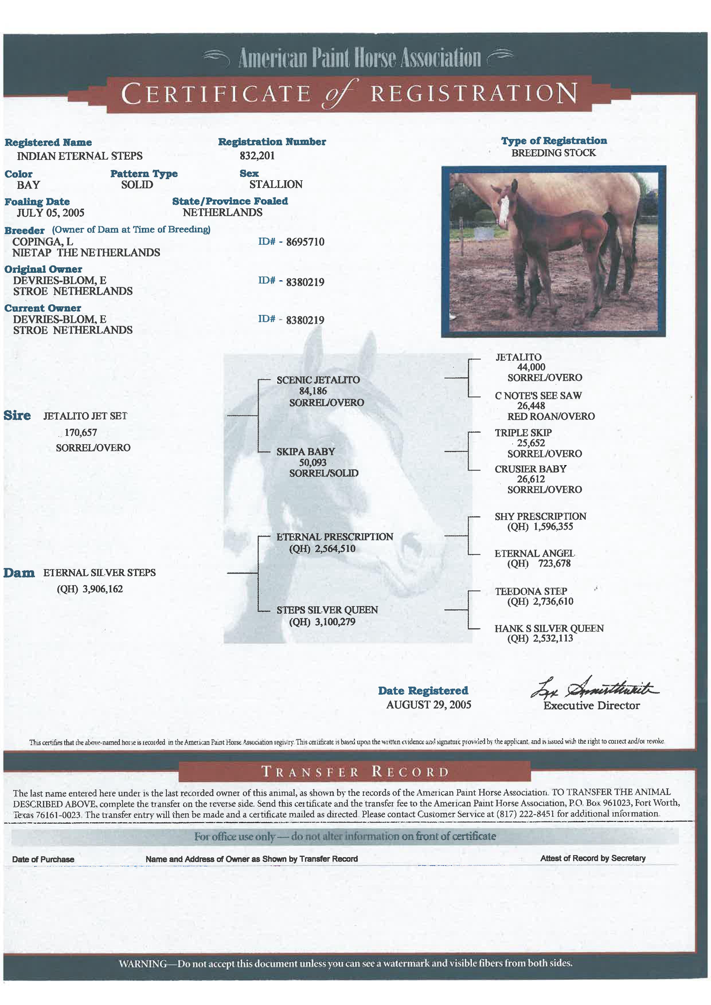 Indian Eternal Steps, v. PH Jetalito Jet Set, m. QH Eternal Silver Steps (kleindochter van Teedona step). Hij is een solid paint ruin in de kleur Bay, met een stokmaat van ongeveer 1.58 m.