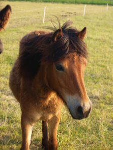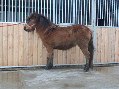 Happy is een merrie van bijna 2 jaar oud gebroren uit een Haflinger moeder van 1,46 en een Shetlander vader van 95 cm.