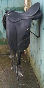 Het zadel wordt verkocht met de bijbehorende singel en zonder de stijgbeugels en riemen.