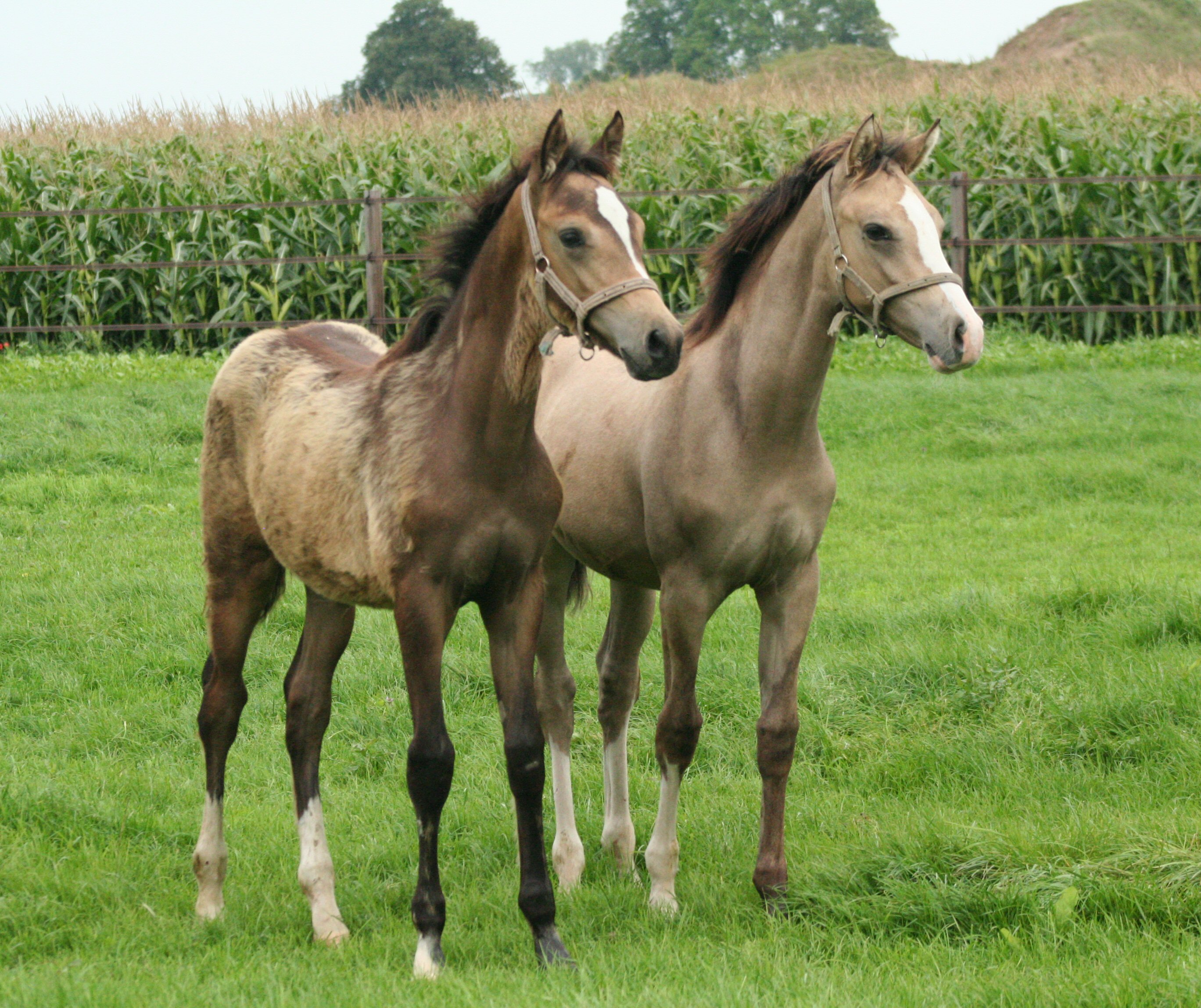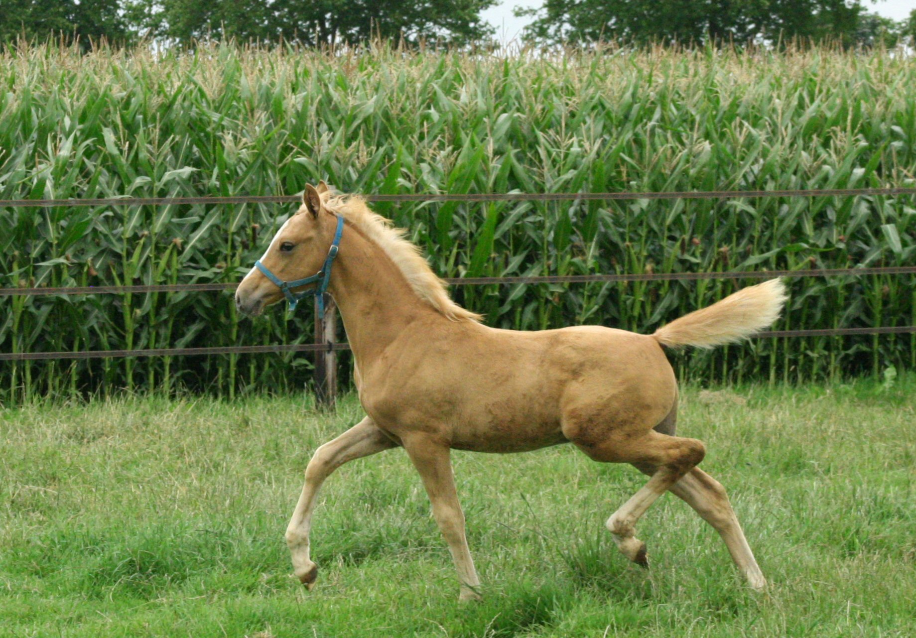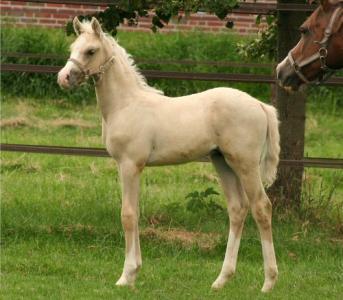 Door de dubbele verdunningskleur ( Cremello) van Don Cremello du Bois, krijgt u altijd een nakomeling met een verdunning. Dus palomino, valk etc