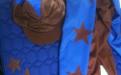 Shirt is bruin, mouwen blauw met bruine sterren.