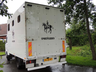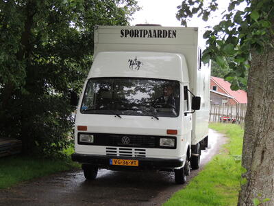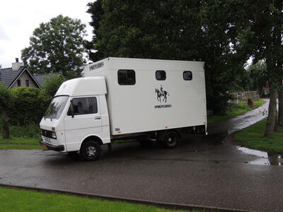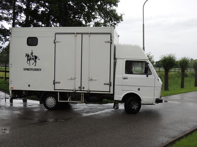 Paardenvrachtwagen uit 1990 VW LT diesel, met zijdeuren en electrische lier + oprijplaten waar de marathonwagen in kan, pony's / paarden via de achterklep.