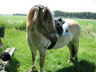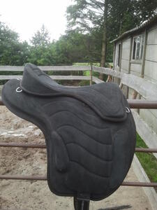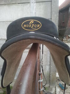 Norton boomloos zadel, super licht gewicht, 17" en geschikt voor een breed paard, paard/pony met brede vlakke rug, dit heeft hiervoor op een brede fjord gelegen. (ook een paar keer op een belgisch trekpaard en een tuiger) Het zadel is gebruikt maar is nog helemaal in goede staat. Ik verkoop dit zadel omdat we de fjord niet meer hebben en ik daarom dit zadel niet meer gebruik. Het zitvlak zit vast met sterk klittenband. Er zit een losse boom bij die je daar tussen kan doen. (dit is alleen een klein stuk ijzer). Ik heb nog een singel (75 cm, met elastiek) die je mee kan/mag nemen, bij de singel is wel duidelijk te zien dat het gebruikt is.