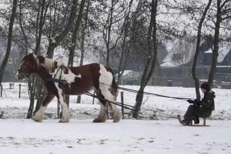 De voorbereiding voor het mennen zijn ook gedaan zo sleept zij maandelijks de weide in de zomer en in de winter spannen wij haar voor de sleede